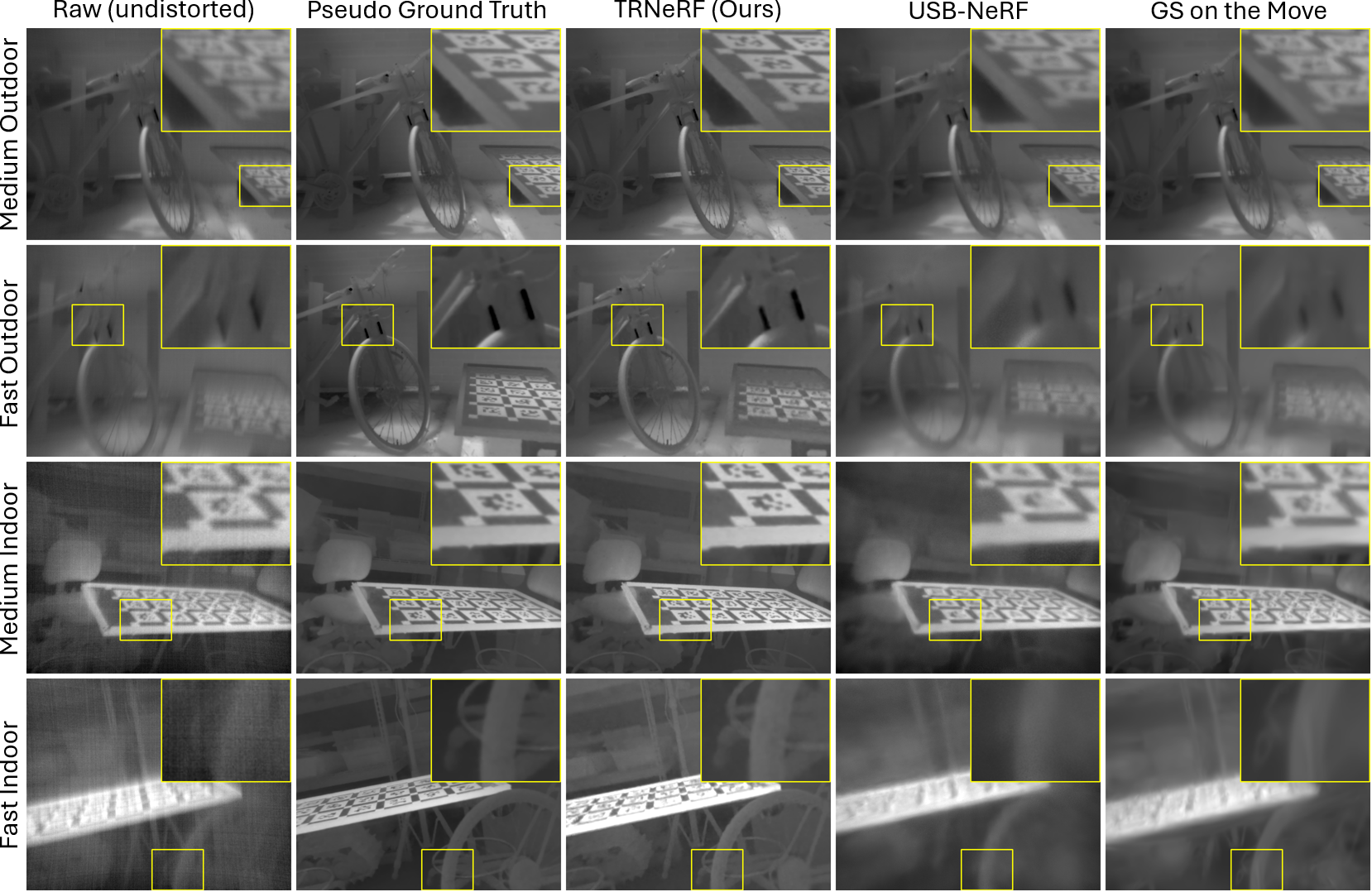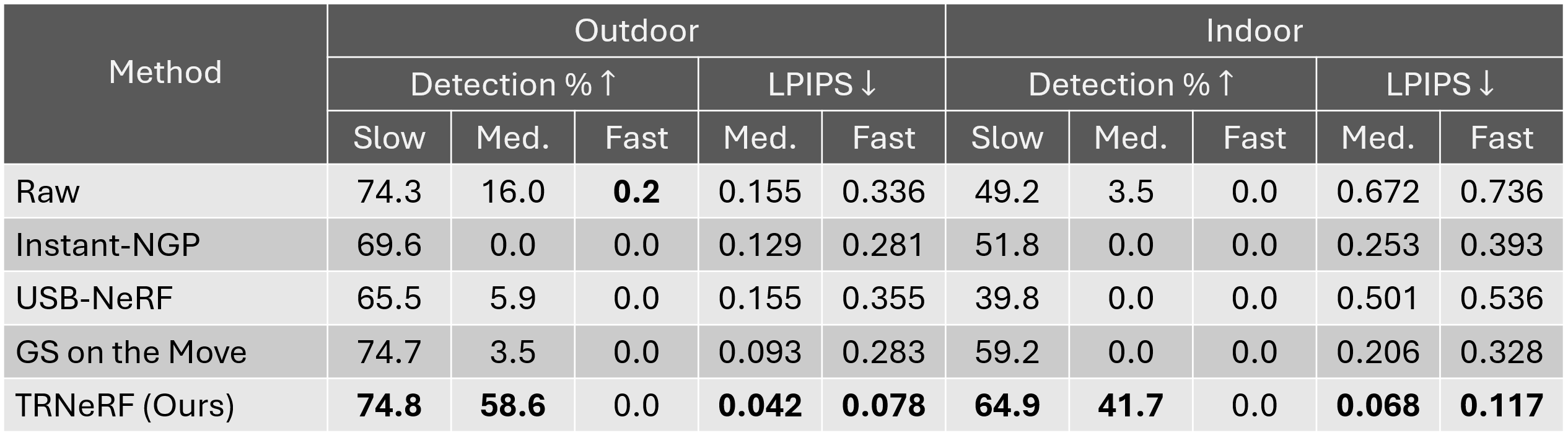 We compare against state-of-the-art NeRF- and 3DGS-based restoration baselines and Instant-NGP (which we modify in our method). The qualitative and quantitative results are shown below, alongside the results of applying our evaluation methods to the raw images (after lens-undistortion). The detection percentage results with the raw images confirm that the slow sequence images are not substantially degraded, especially in the high thermal contrast outdoor scene where the FPN is less significant. Our method significantly outperforms the baselines on the medium and fast sequences (with the exception of the detection percentage metric on the fast sequences, which may stem from the reflective board being particularly difficult to restore).